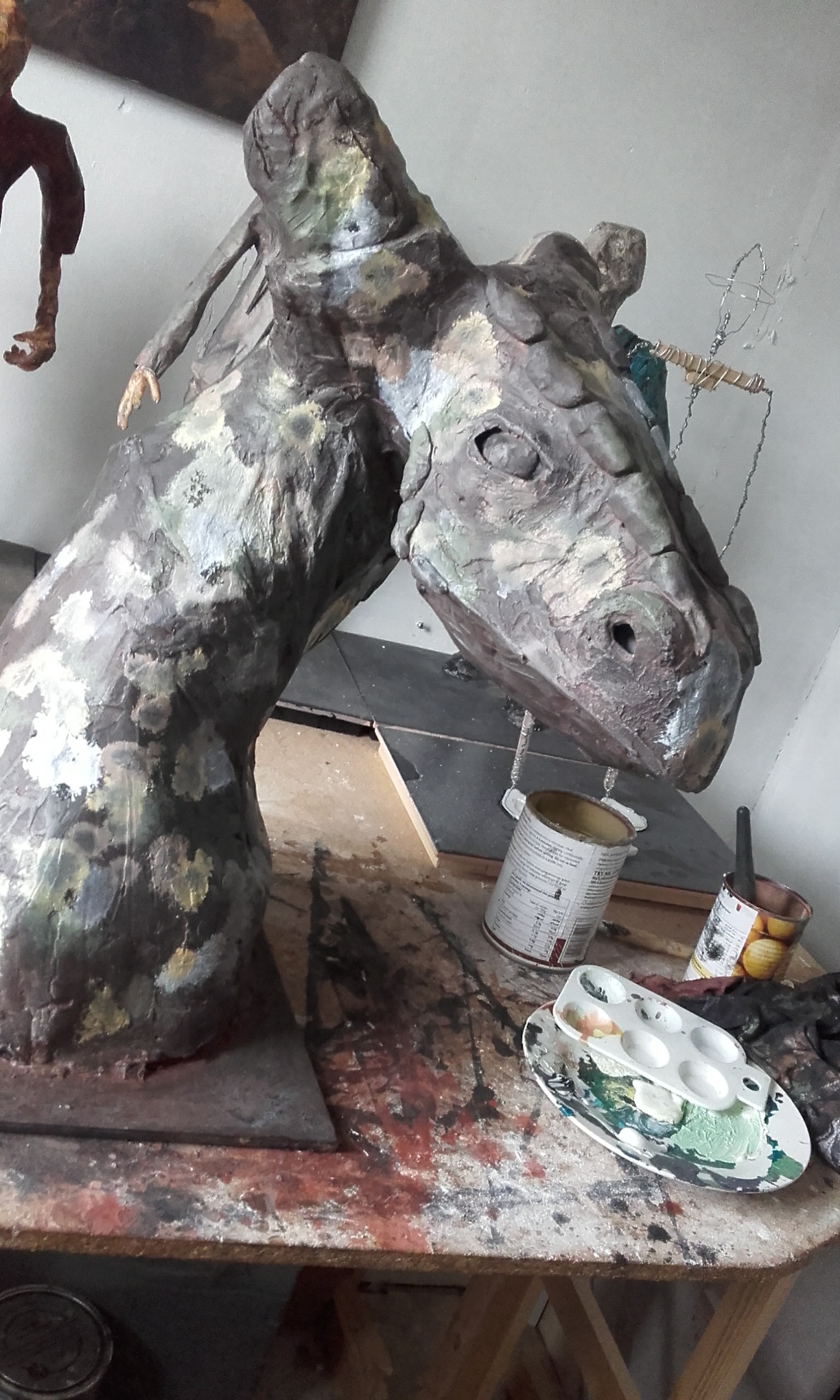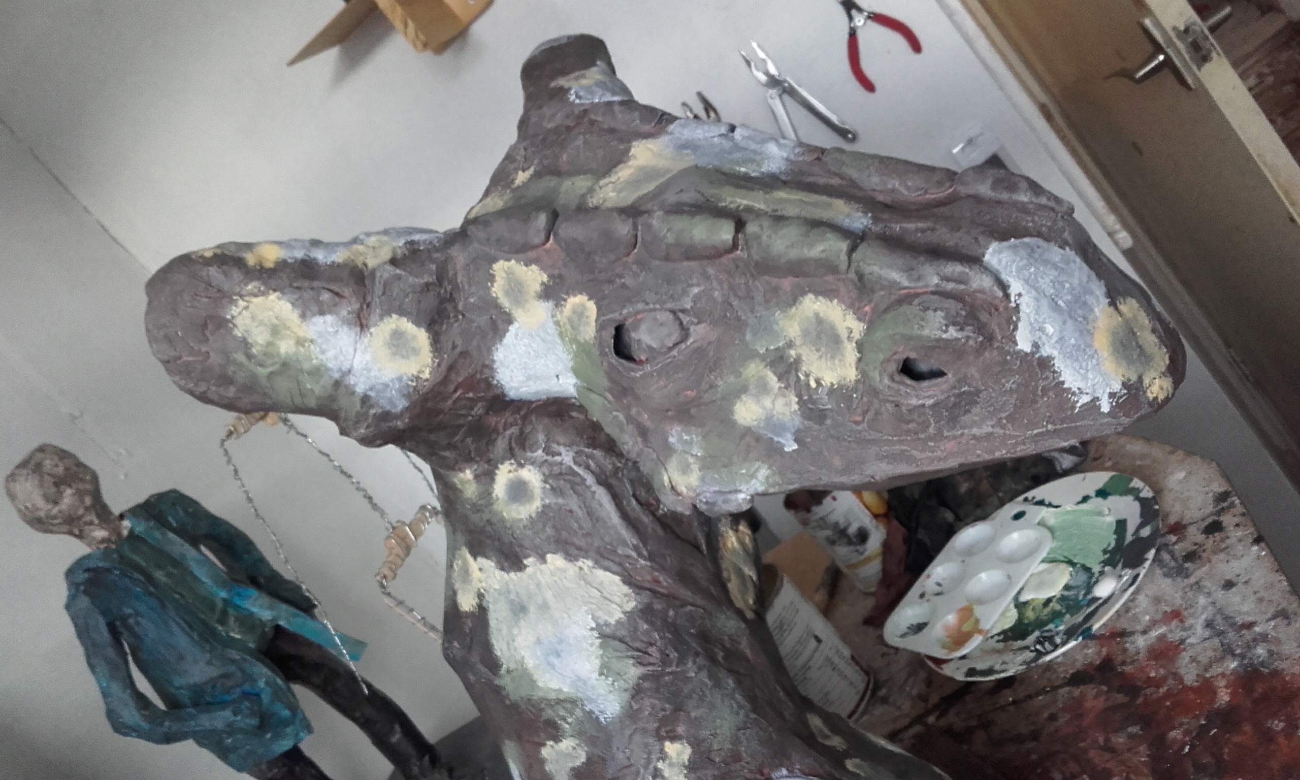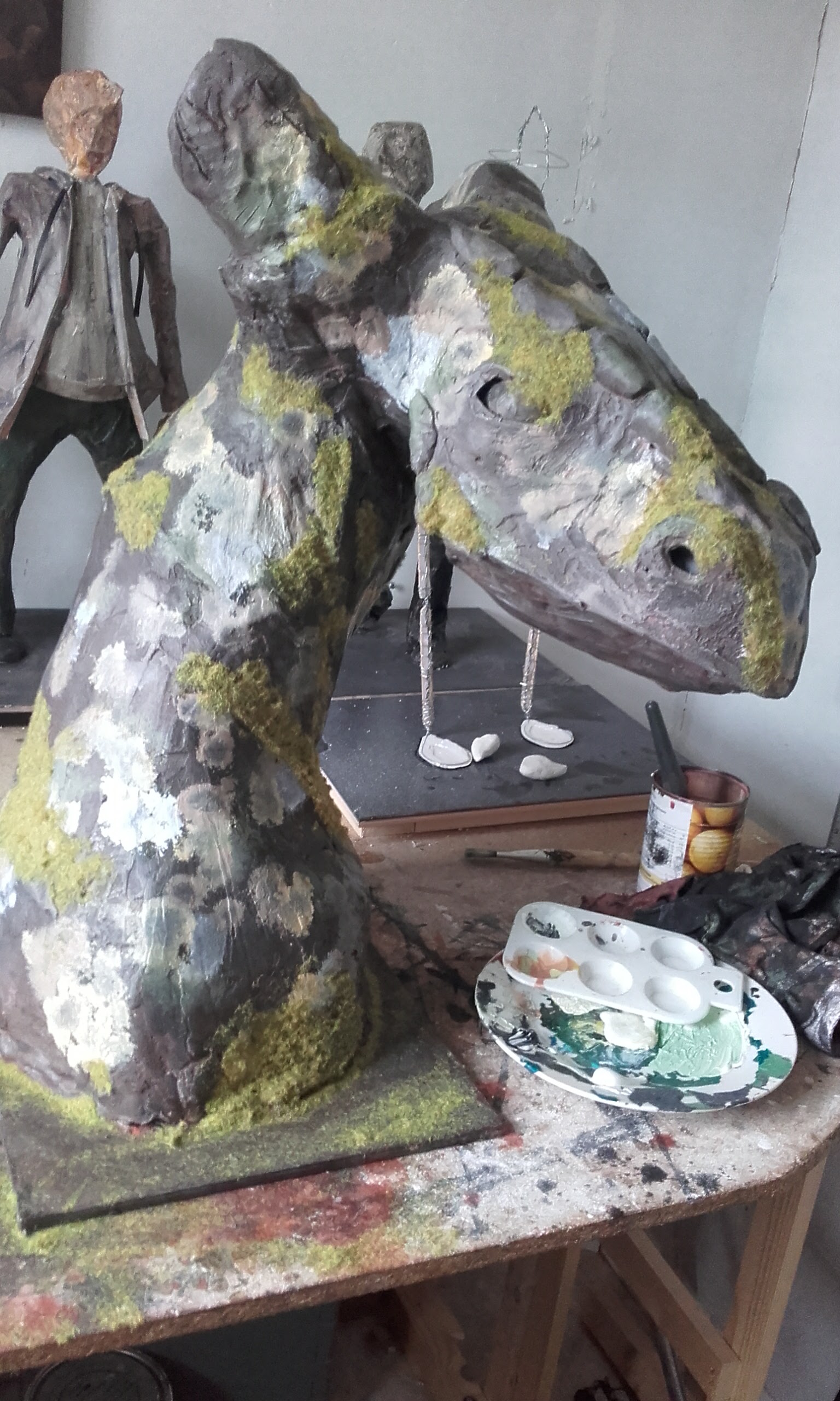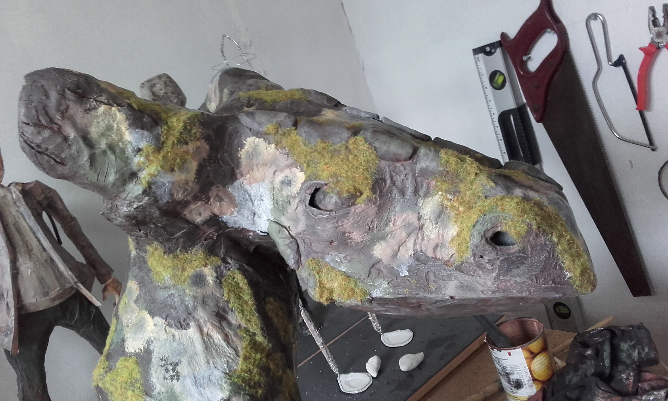 The dragon head was a project to see what I could do with paper mache. The support frame is a simple wire skeleton with paper mache applied on the top of this. The final layer was a thin coating of plaster, sanded whilst still damp to remove chunks. The model was then painted with model makers grass applied to simulate moss.