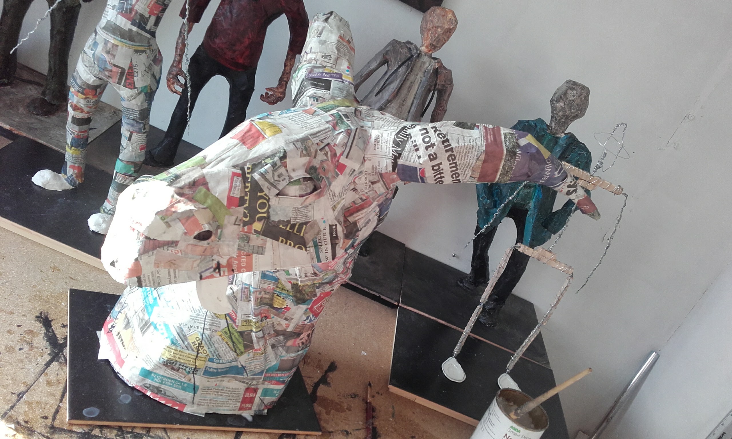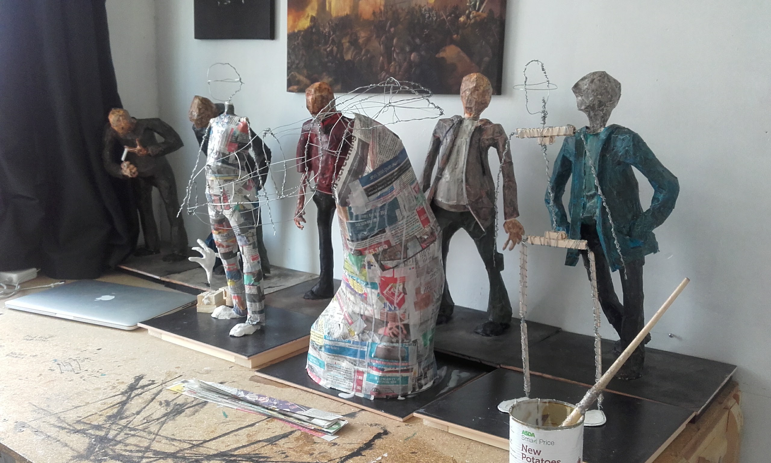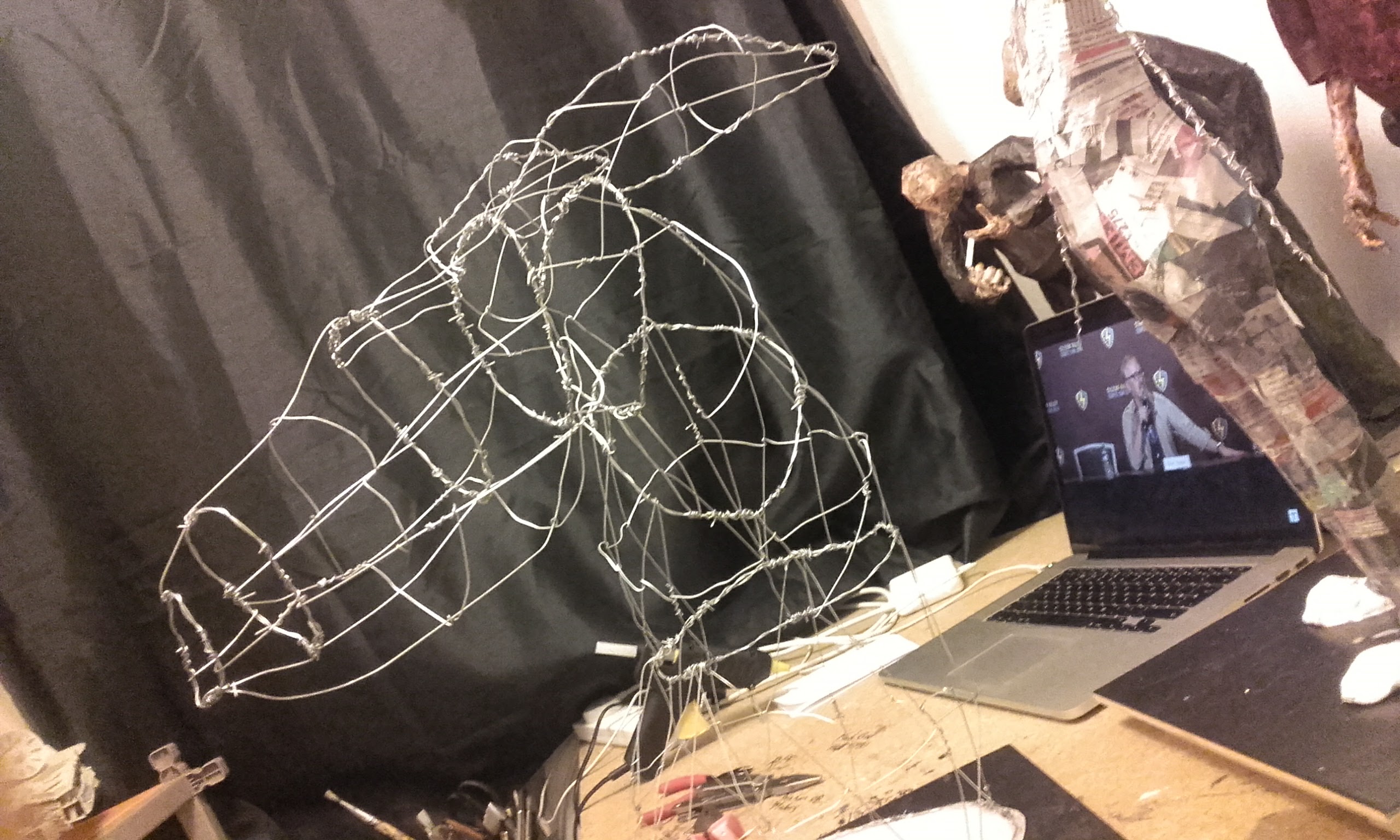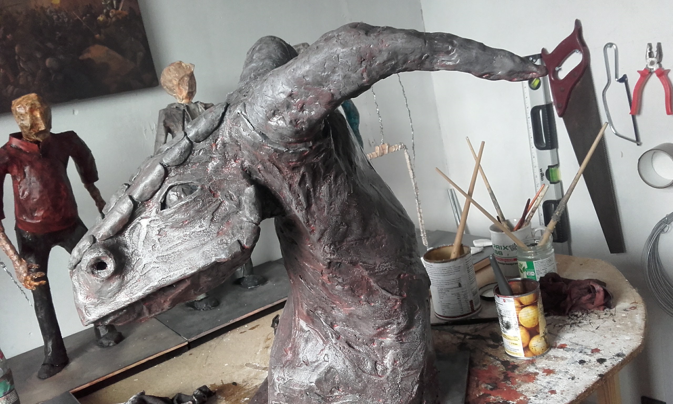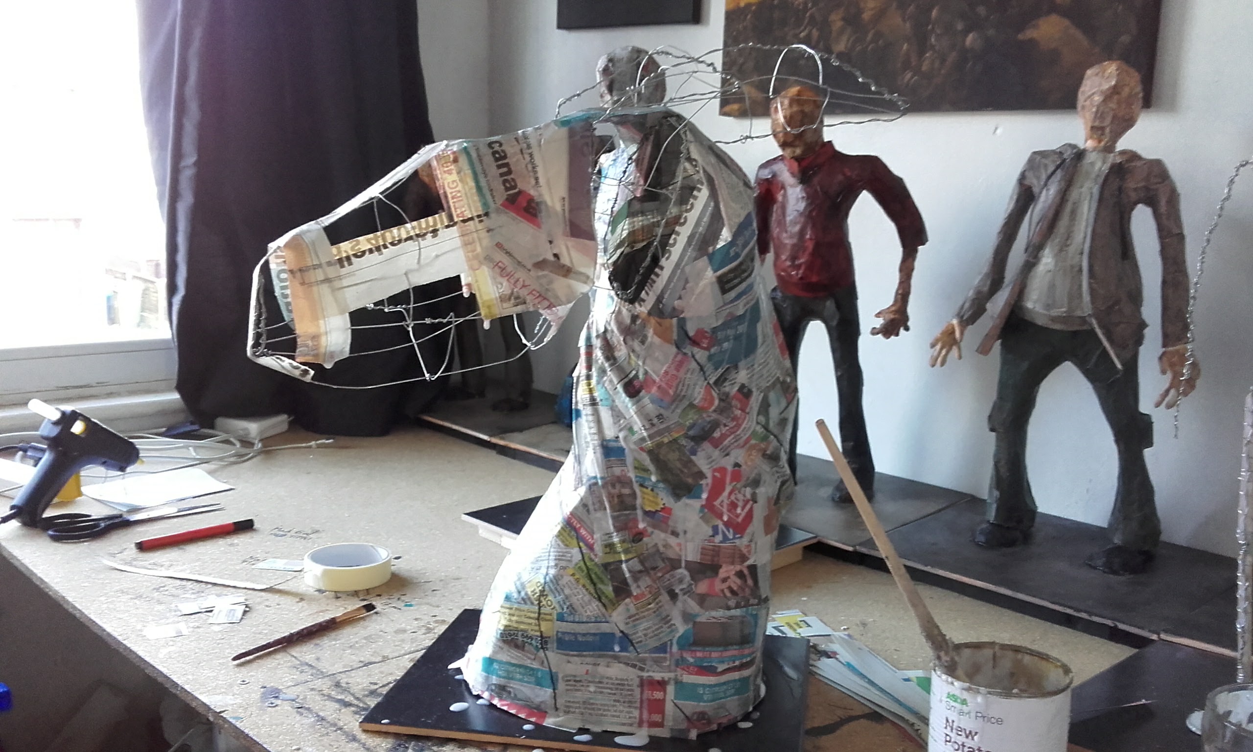 The dragon head was a project to see what I could do with paper mache. The support frame is a simple wire skeleton with paper mache applied on the top of this. The final layer was a thin coating of plaster, sanded whilst still damp to remove chunks. The model was then painted with model makers grass applied to simulate moss.